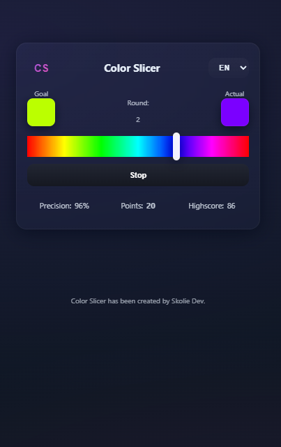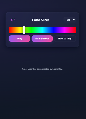 Color Slicer is a small, polished web mini-game where you must stop a moving color slider as close as possible to a target color. The interface is minimalist and mobile-friendly, with smooth animations and an elegant glass/neumorphic UI.